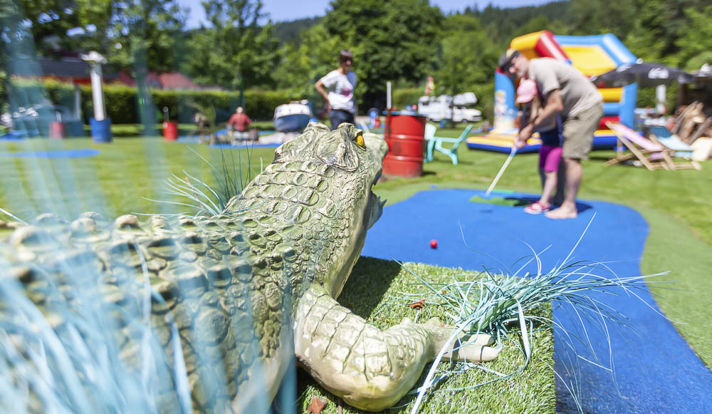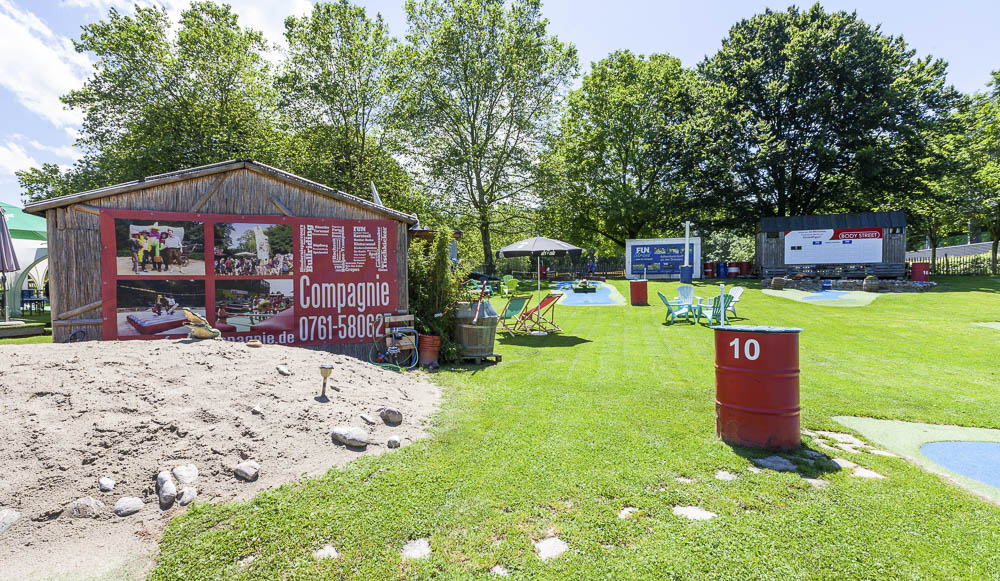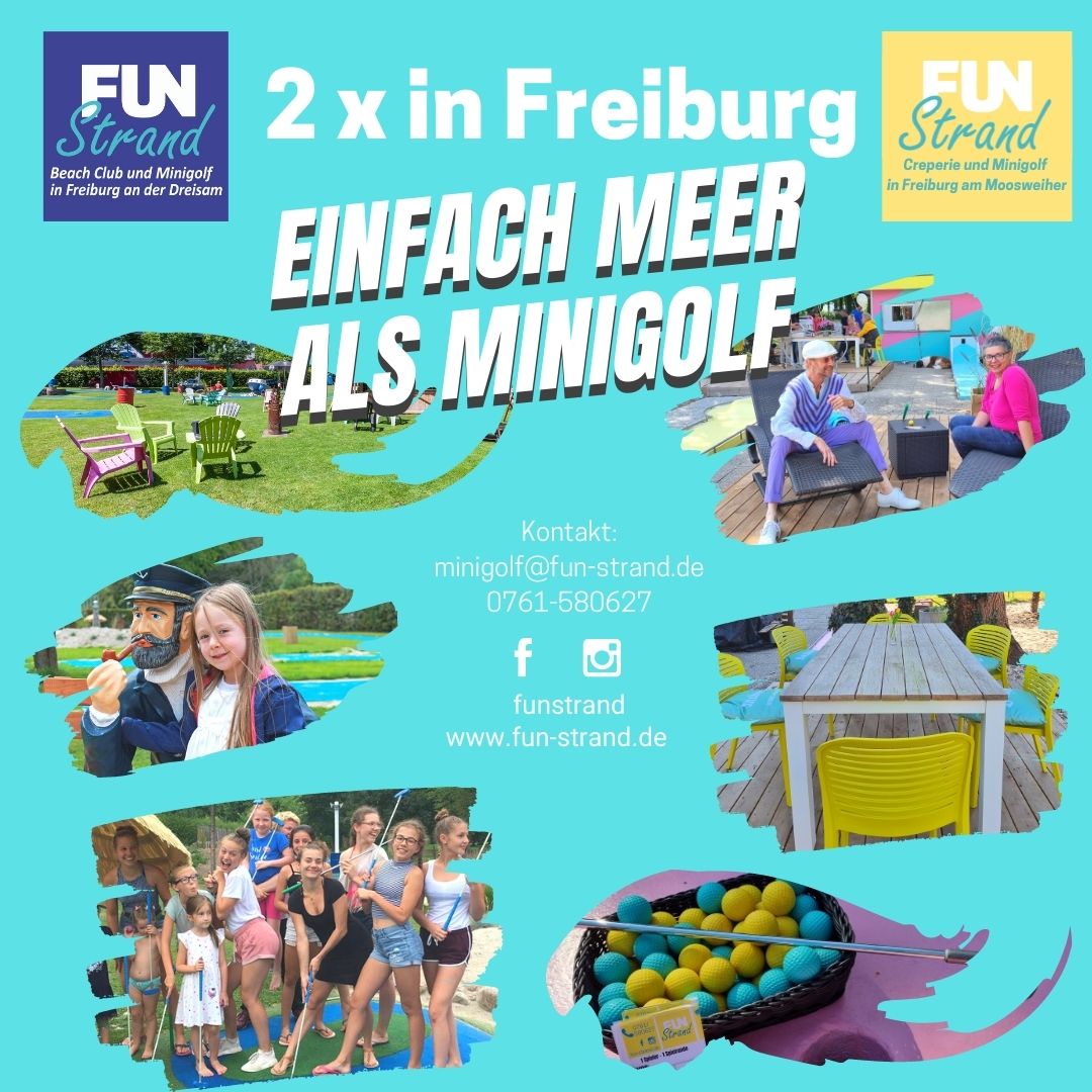Zusätzlich zum Fun Strand an der Dreisam haben wir vergangenes Jahr den traditionellen Minigolf-Platz am Moosweiher in Landwasser übernommen. Nach achtmonatiger Umbauzeit ist dort ein farbenfroher Platz mit 1000 qm Sandstrand und Creperie entstanden. Dort haben wir momentan auch bereits am Wochenende (Samstag ab 14 Uhr, Sonntag ab 12 Uhr) geöffnet.